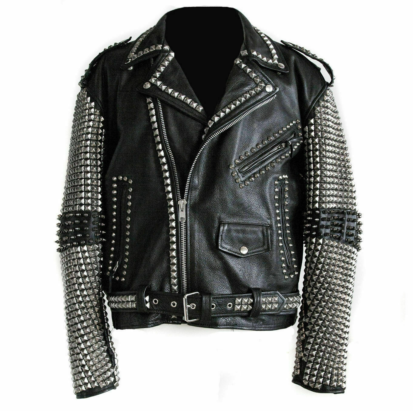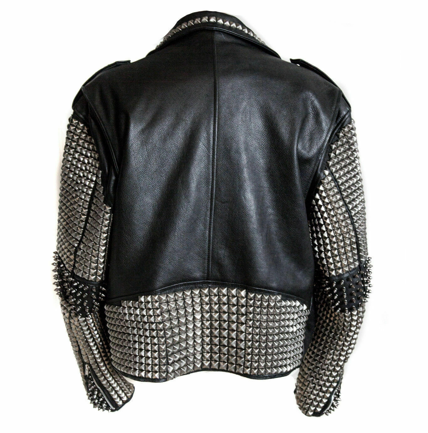 Mens Fashion Jackets Silver Studded Leather Real Leather Slim Fit Biker Jackets
