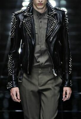 Man Handmade Jackets Silver Studded Cowhide Leather Zipper Style