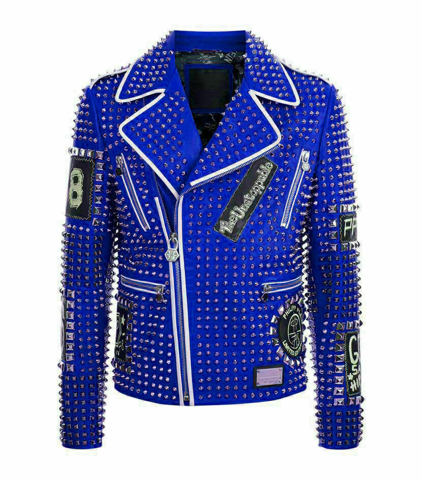 New Men's Philip Full Blue Studded Punk Embroidery Patches Leather Jacket