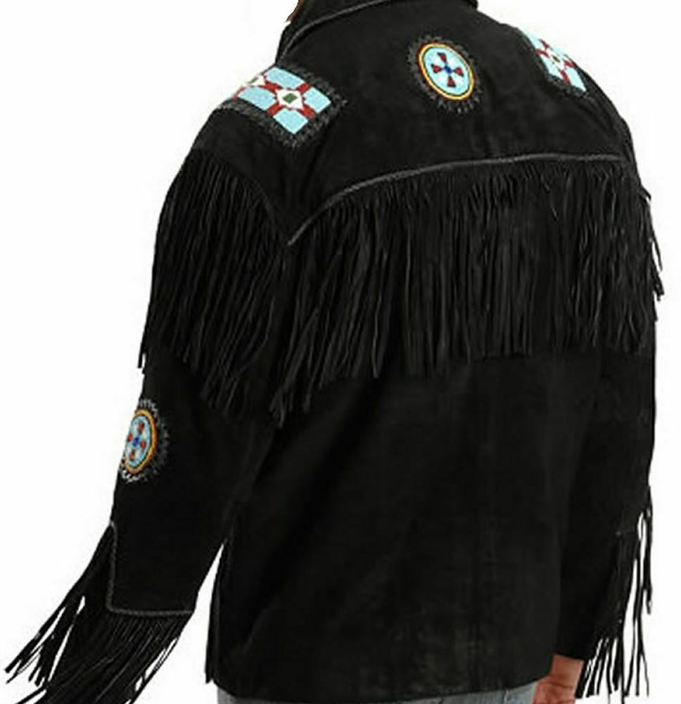 Men Suede Western Cowboy Leather Jacket Bone And Beads Black Fringe