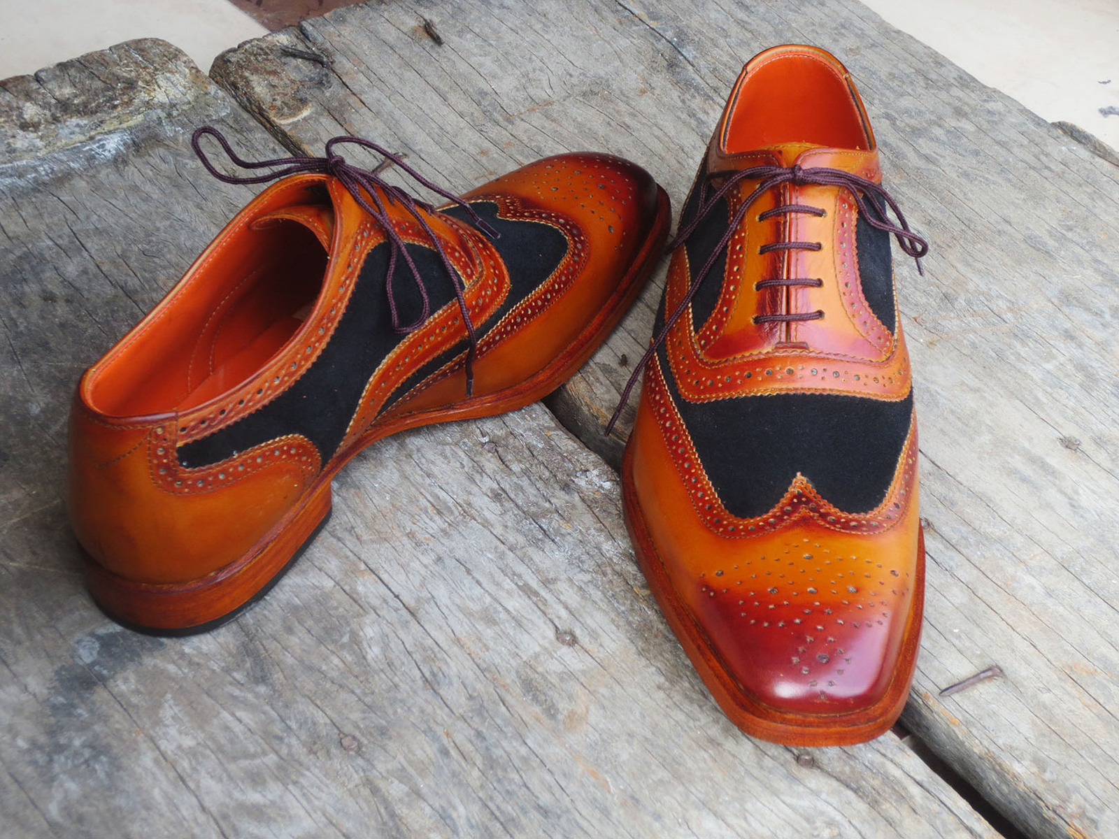 Handmade Men's Tan Black Suede Leather Lace up Wing Tip Brogue Dress Shoes