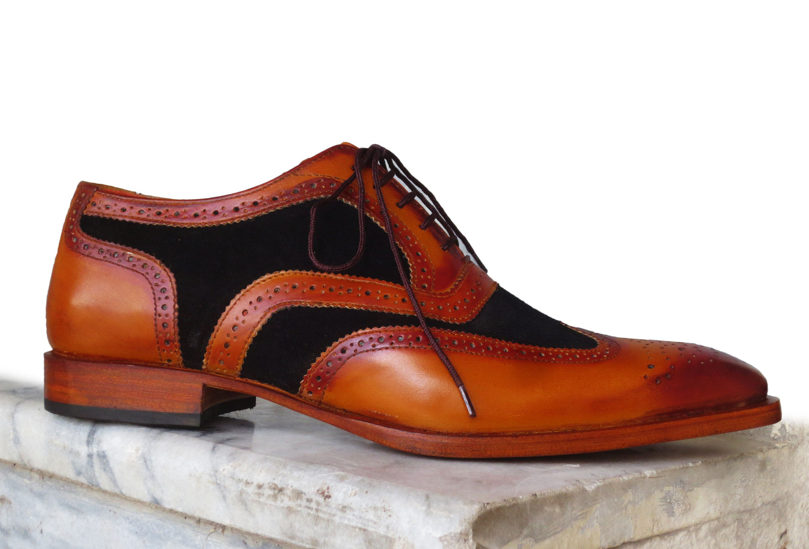 Inner: Soft Sole: Leather Gender : Male Heel: Leather Color: Tan Black Style: Lace up Wing Tip Brogue Shoes Totally Hand stitched Manufacturing time 7-10 business days If you can’t find your Size/Color just send us message we will make for you.