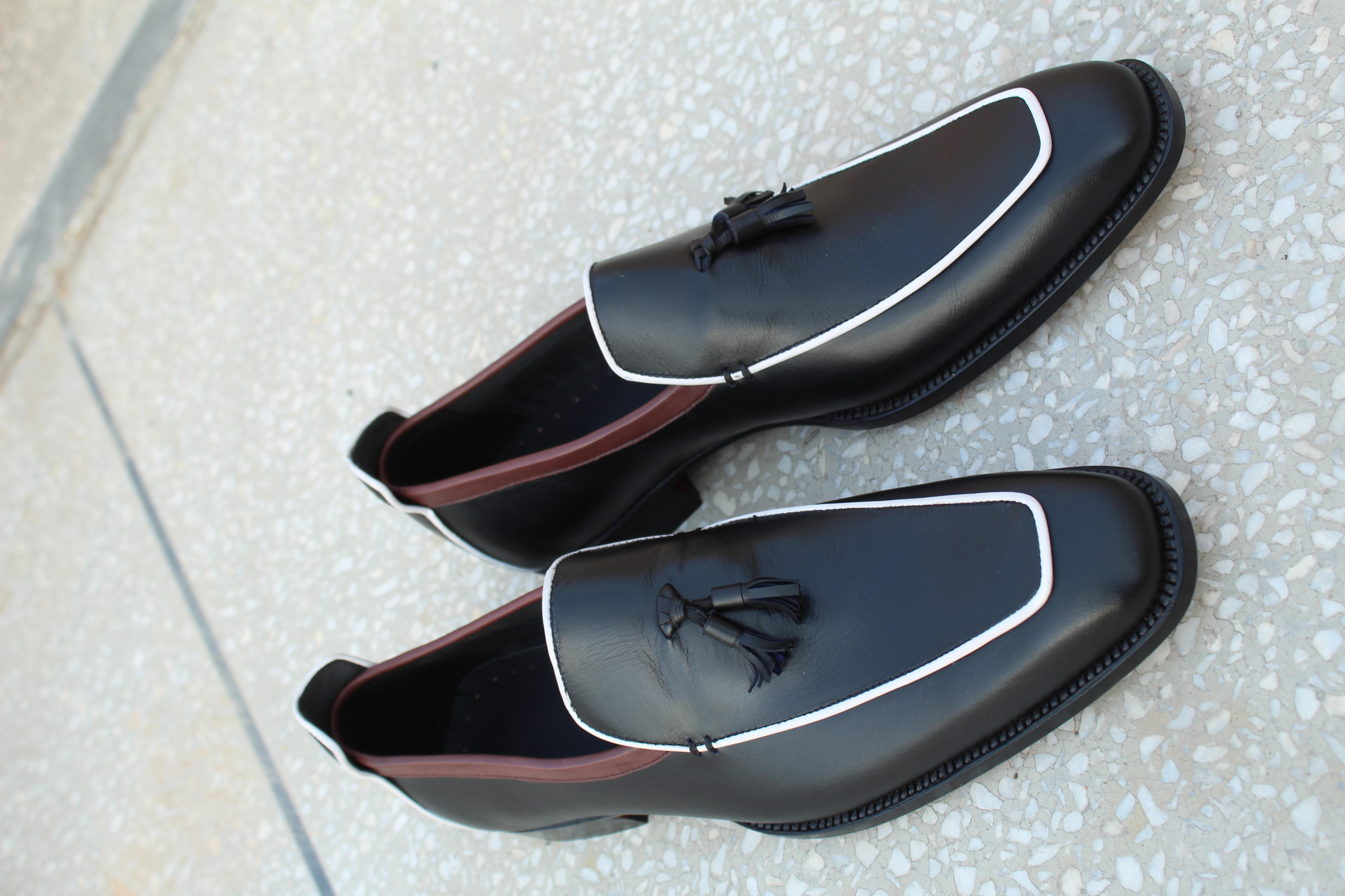 Classic Handmade Black with White Lining Tassel Loafers Shoes