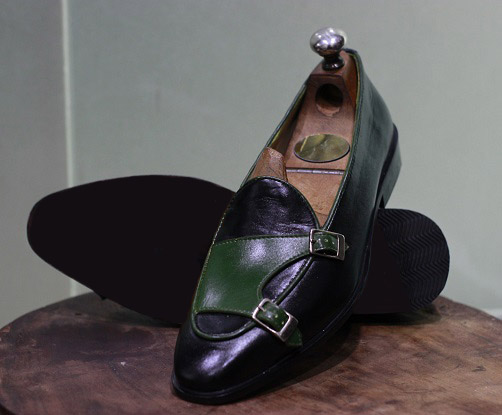New Men's Handmade Shoes Black & Green Leather Double Buckle Slip On Dress & Casual Wear Loafer Boots