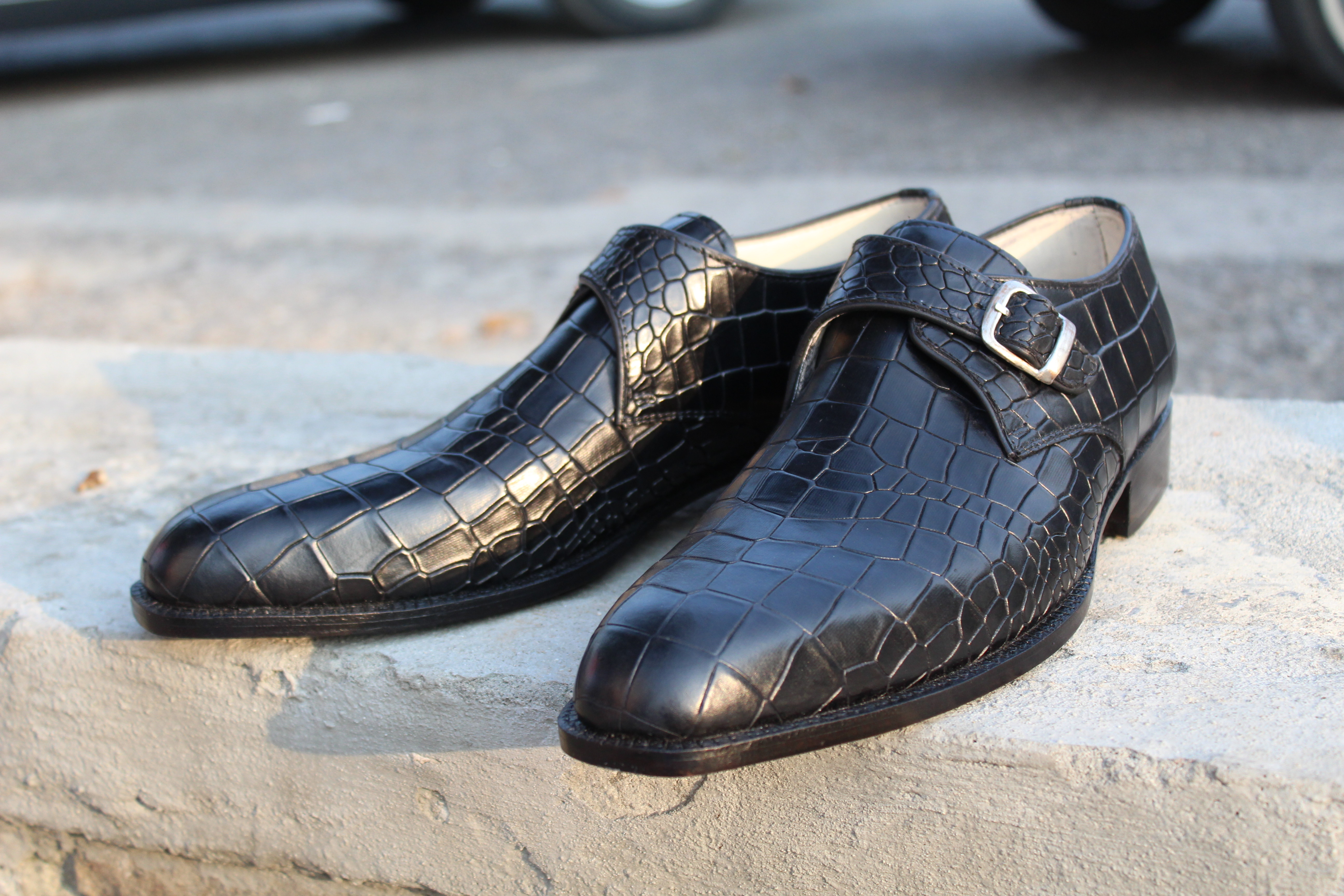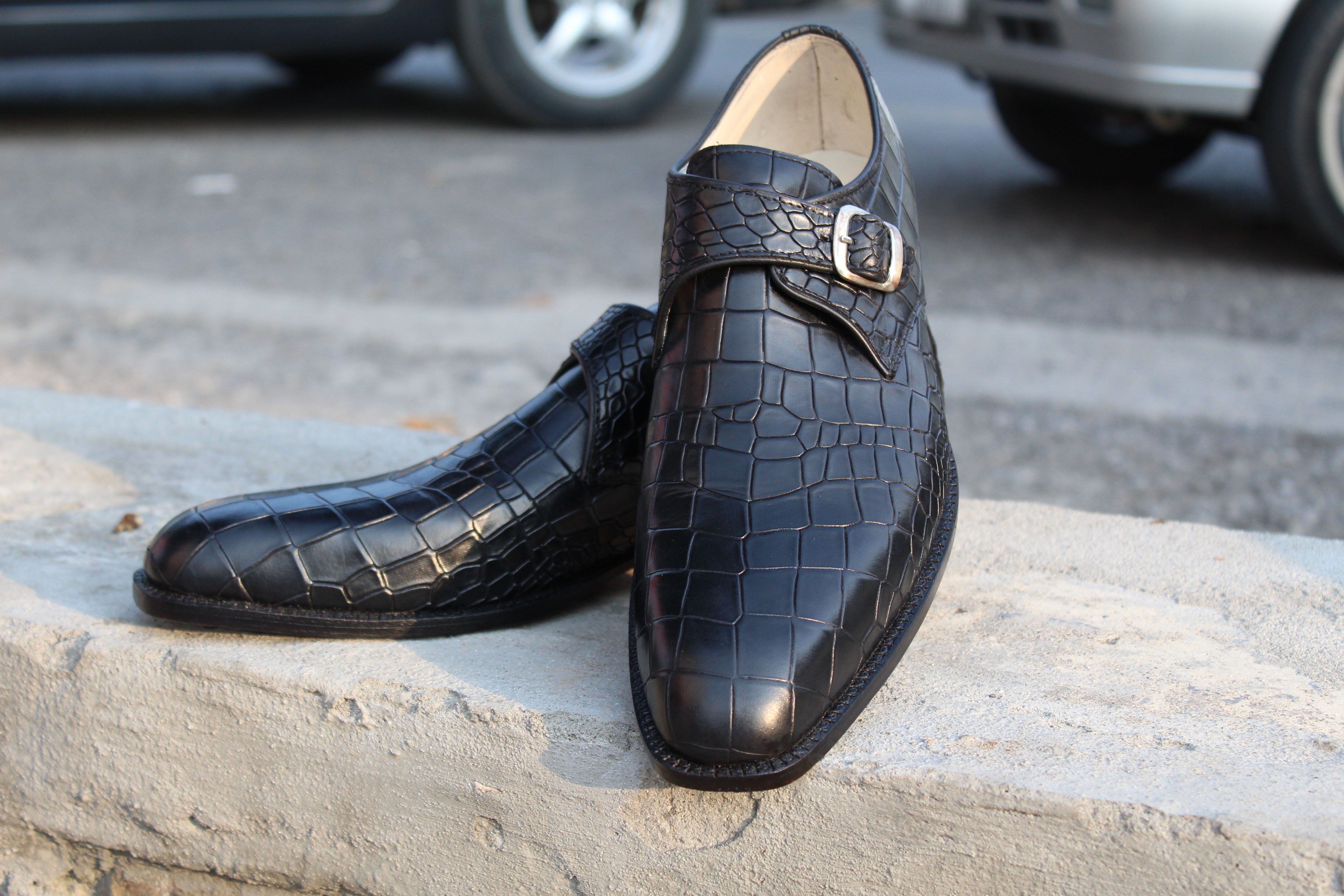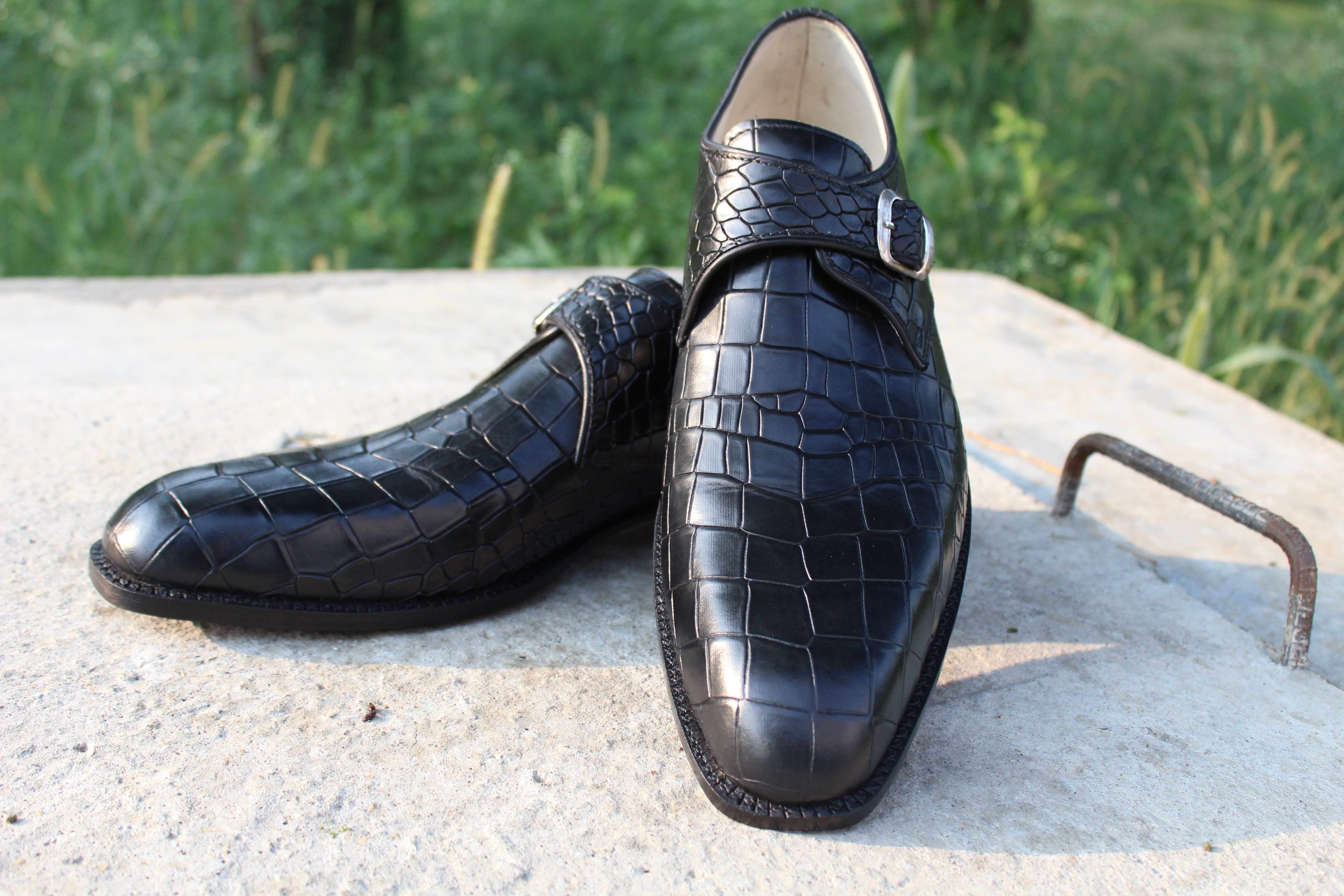 Black Crocodile Texture Leather Single Monk Strap Alligator Dress Shoes