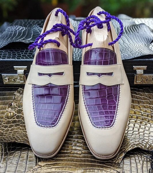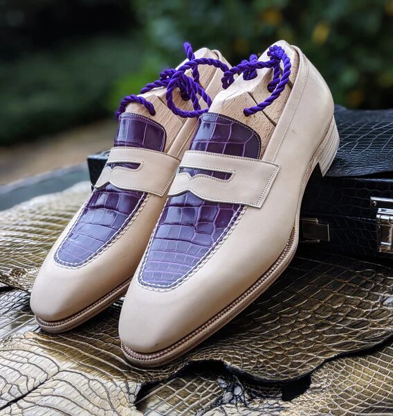 Inner: Soft Sole: Leather Gender : Male Heel: Leather Color: Cream / Purple Style: Dress Shoes Totally Hand stitched Manufacturing time 7-10 business days If you can’t find your Size/Color just send us message we will make for you.
