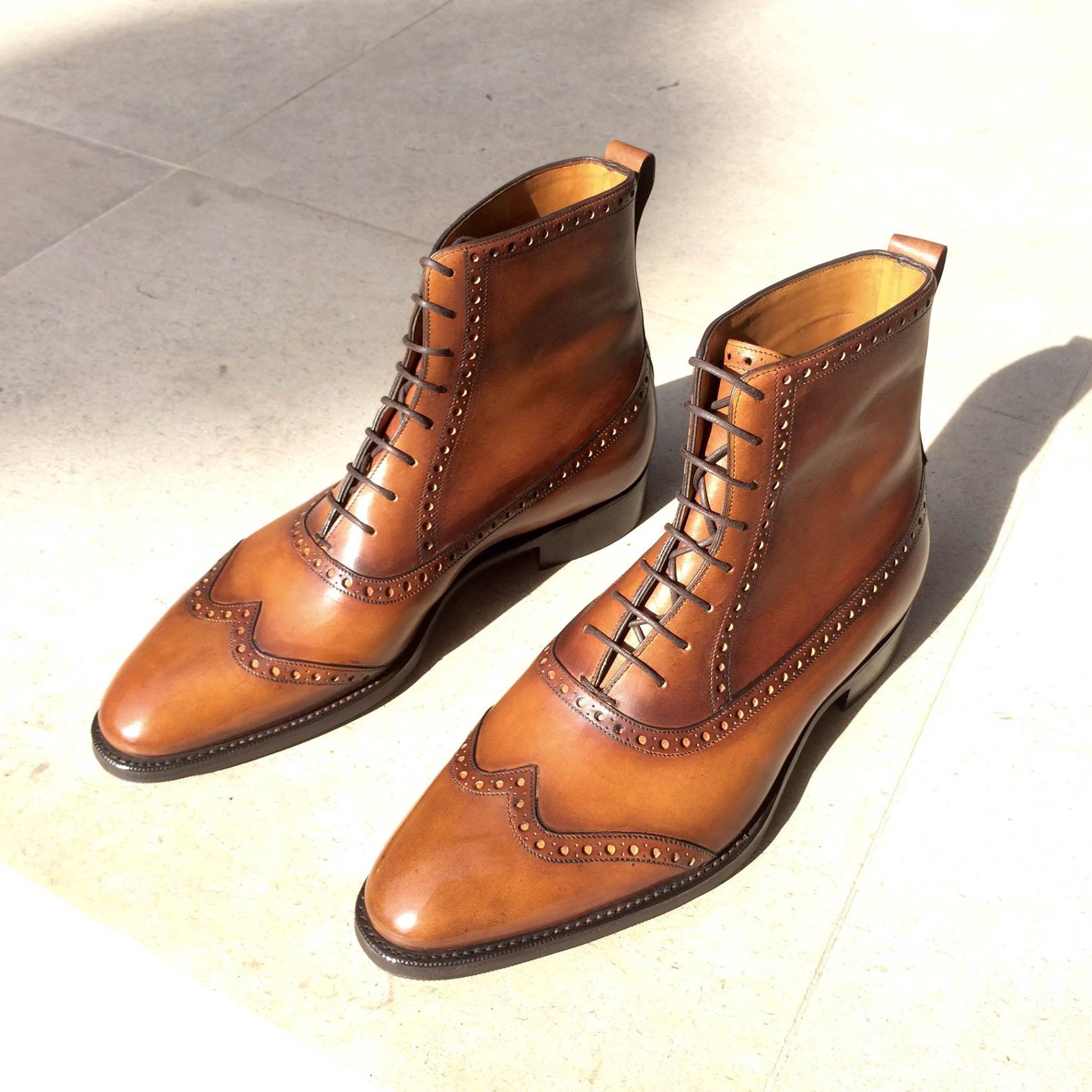 Inner: Soft Sole: Leather Gender : Male Heel: Leather Color: Brown Style: Ankle High Lace up Boot Totally Hand stitched Manufacturing time 7-10 business days If you can’t find your Size/Color just send us message we will make for you.