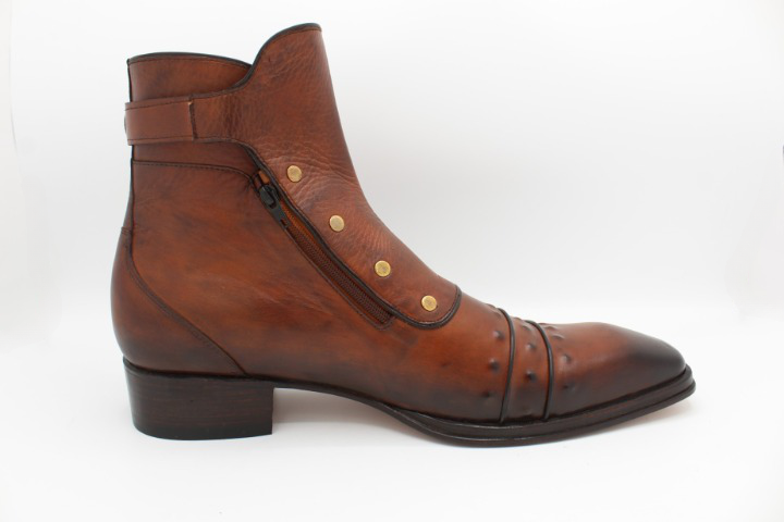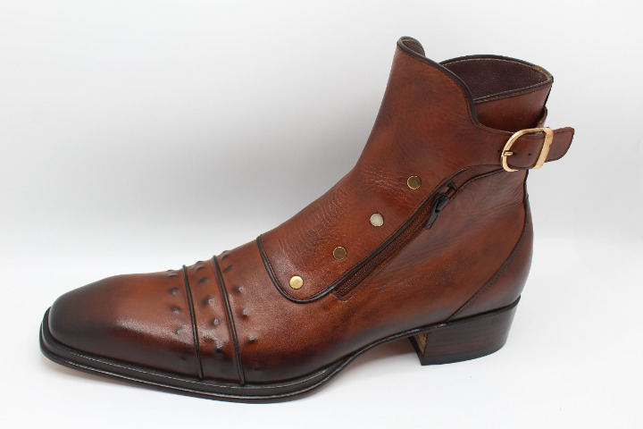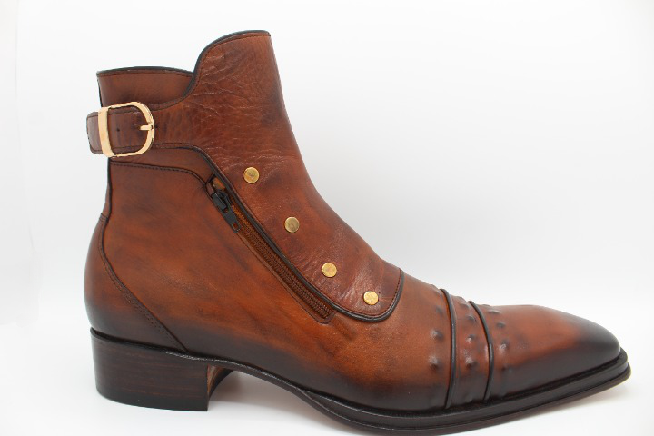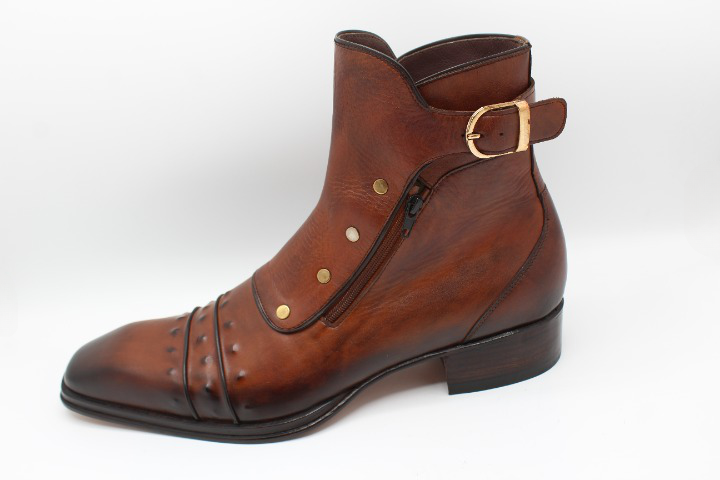 Inner: Soft Sole: Leather Gender : Male Heel: Leather Color: Brown Style: Ankle High Plato Designer Boot Hand-Painted Calf-Skin Leather Upper Hardware: Golden Buckle / Zipper Cap-Toe Boots Design Zipper & Buckle on Side Totally Hand stitched Manufacturing time 7-10 business days If you can’t find your Size/Color just send us message we will make for you.