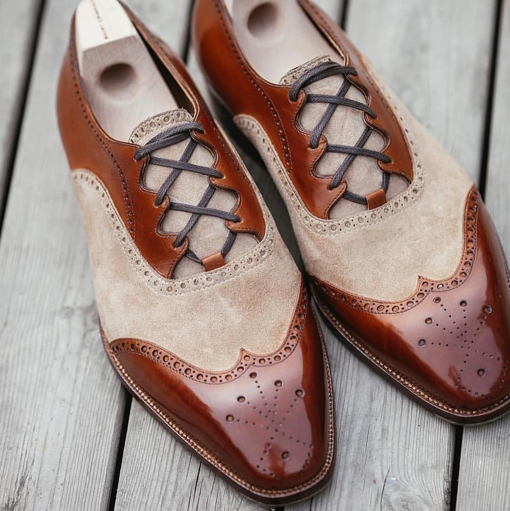 Handmade Wingtip Brown Lacing in a Beige Sand Suede Leather Dress Shoes