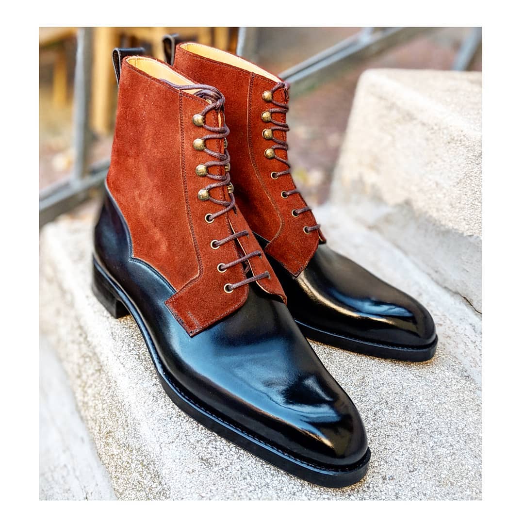 Handmade Men Black Genuine Leather and Suede Ankle High Dress Boot