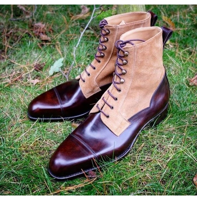 Men's Brogue Ankle High Burgundy Beige Leather & Suede Lace up Boots