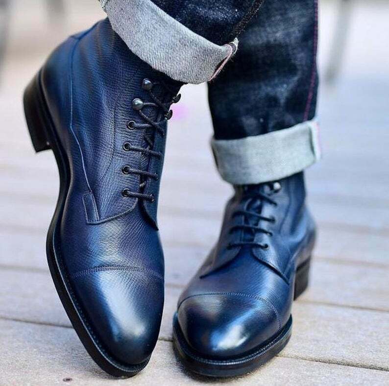 Inner: Soft Sole: Leather Gender : Male Heel: Leather Color: Dark Blue Style: Lace up Ankle Boots Lining Soft Calf Leather Lining Totally Hand stitched Manufacturing time 7-10 business days If you can’t find your Size/Color just send us message we will make for you.