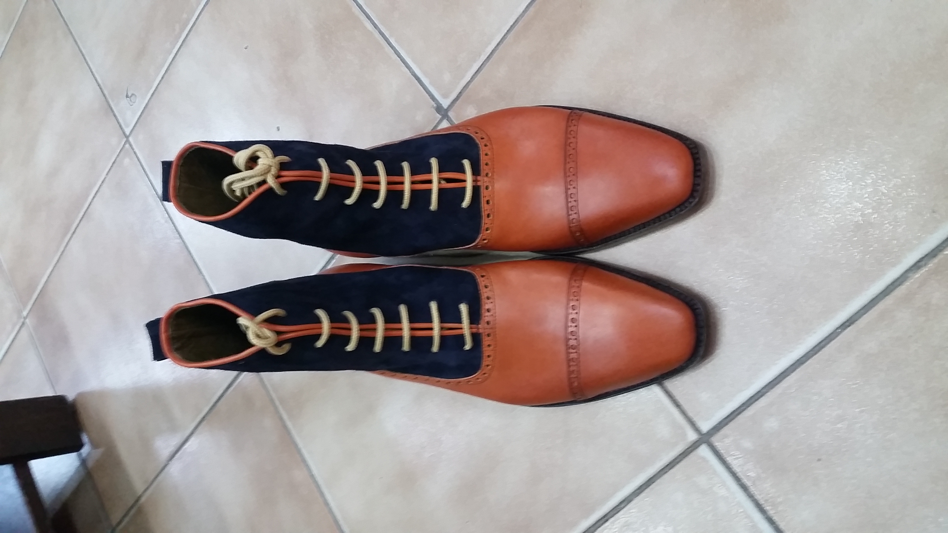 Inner: Soft Sole: Leather Gender : Male Heel: Leather Color: Blue / Brown Style: Ankle High Boot Lining Soft Calf Leather Lining Totally Hand stitched Manufacturing time 7-10 business days If you can’t find your Size/Color just send us message we will make for you.