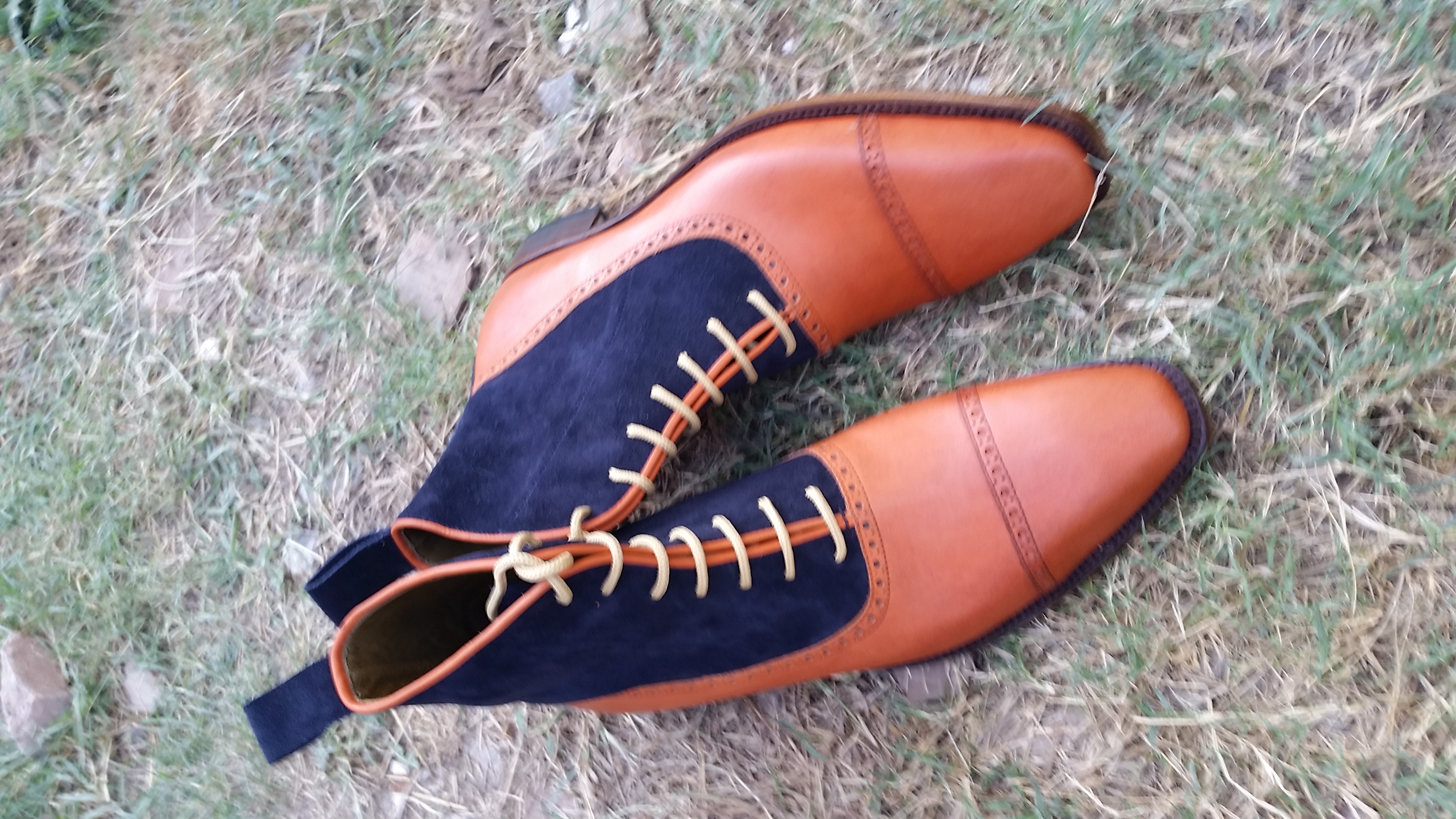 Handmade Brown Leather Blue Suede Unique Ankle High Lace up Dress Boot For Men