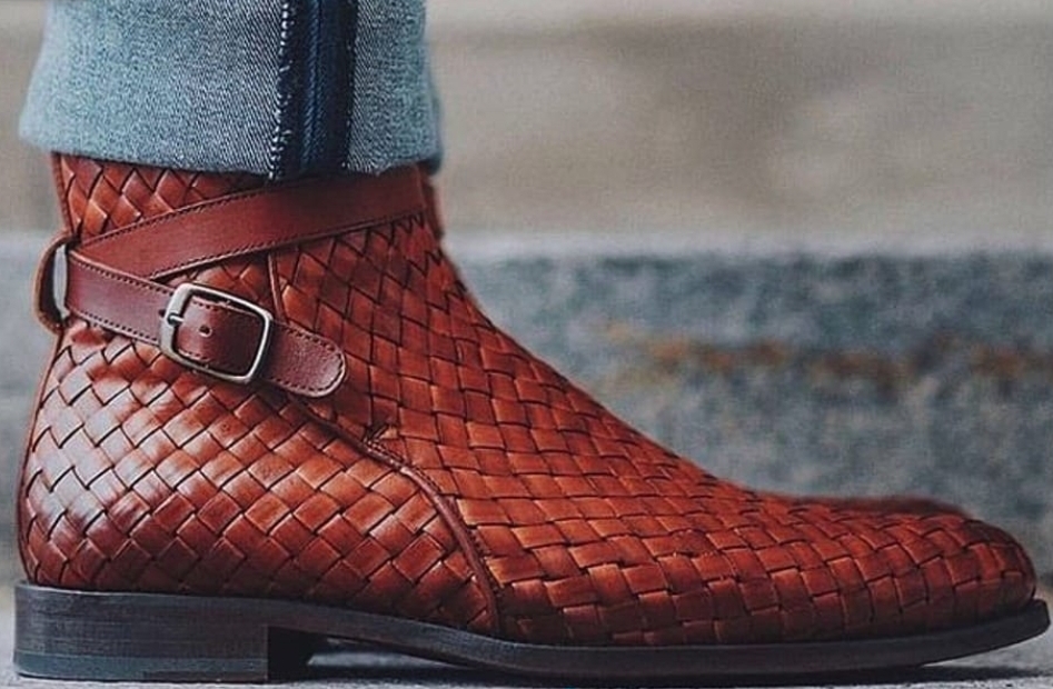Handmade Men Dylan Woven Leather Brown High Ankle Boot