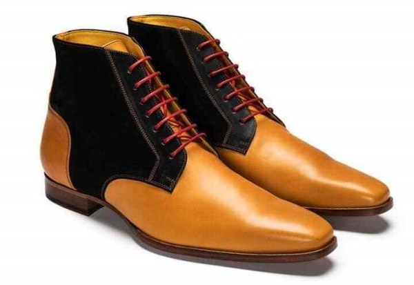 Handmade Men’s Ankle High Leather Suede Derby Boot Men’s Tan Black Color Lace Up Boot