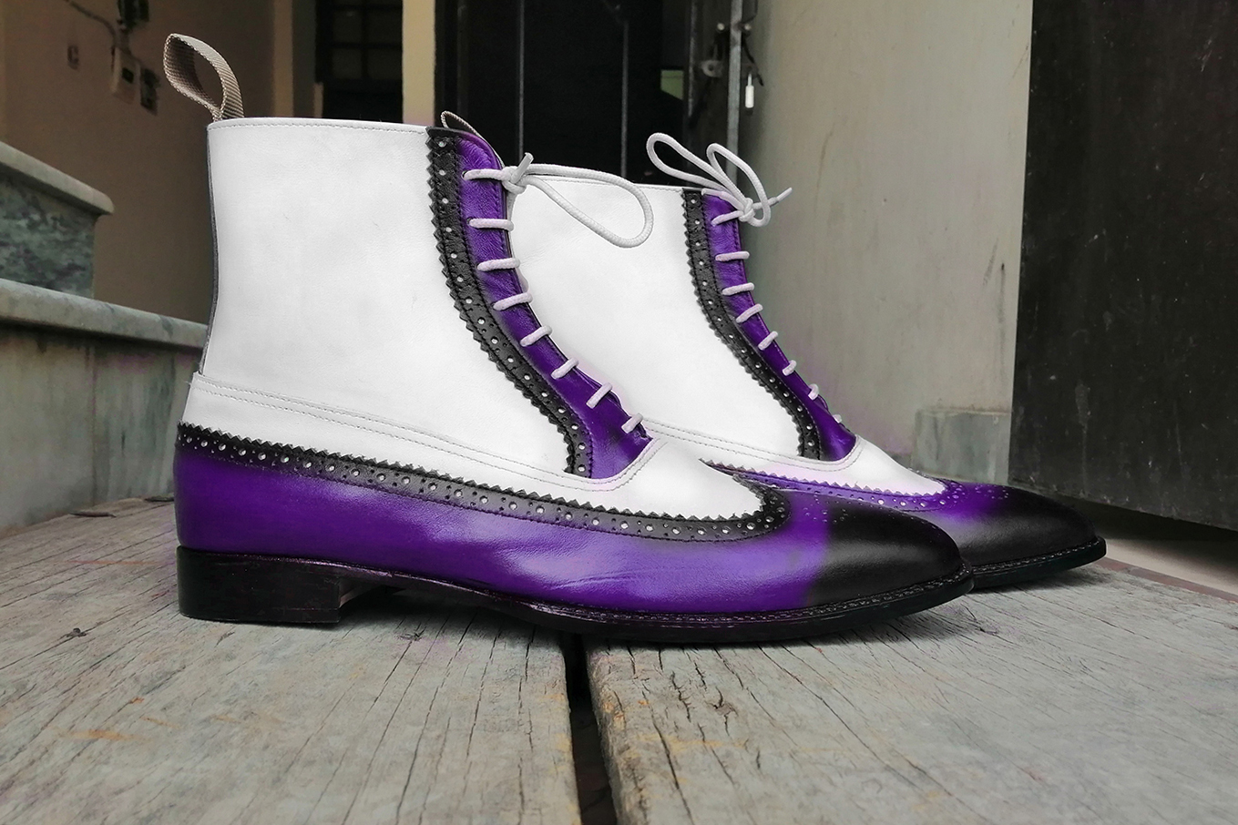 New Men's Handmade Purple Black White Ankle High Leather Lace Up Wing Tip Brogue Boot