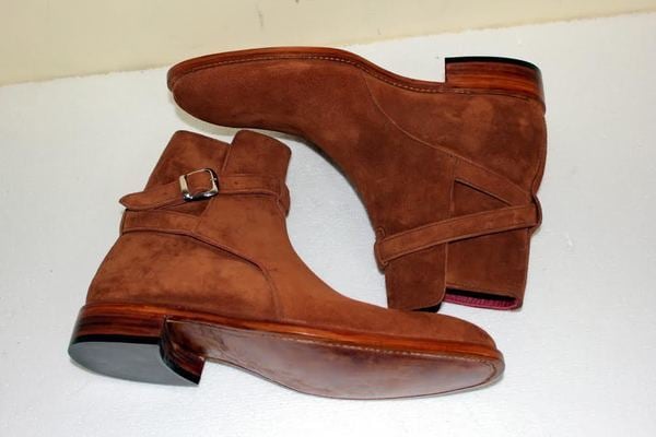 Handmade Men's Tan Bown Suede Leather Jodhpurs Ankle High Strap Boot