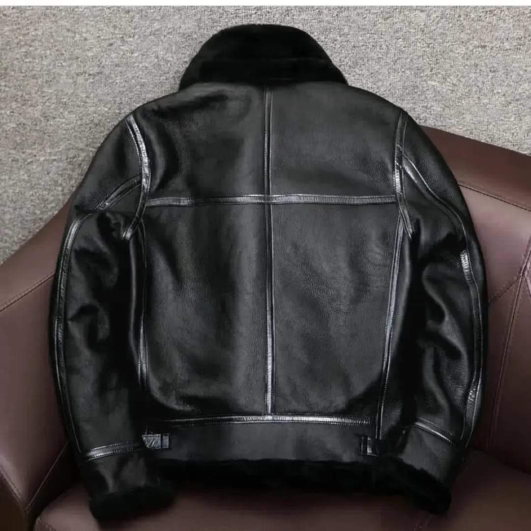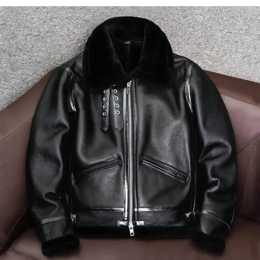 Men Black Punk Fur Jacket, Men Black Sheep Leather Bomber Jacket