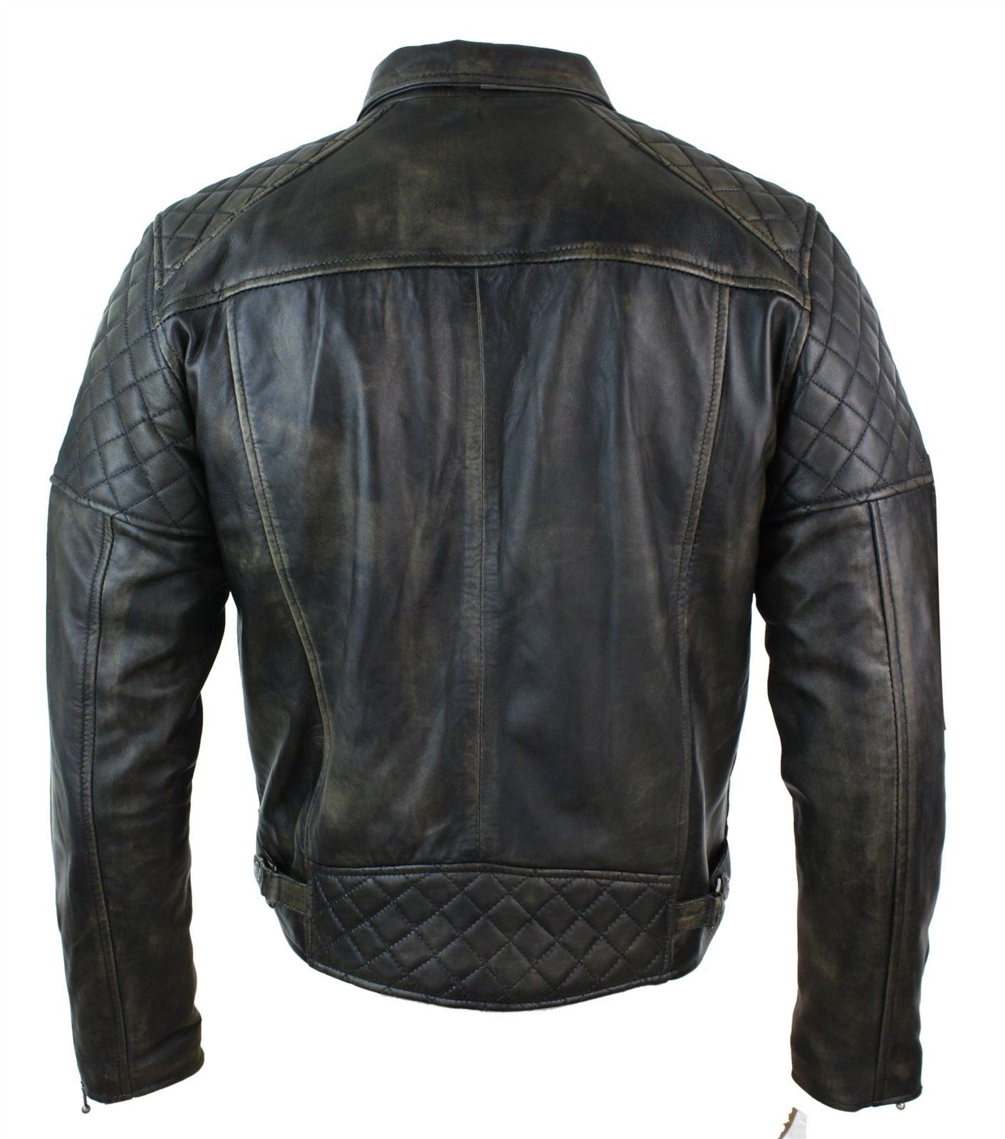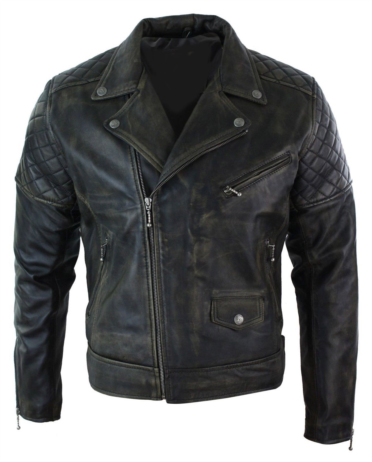 MENS CROSS ZIP BLACK WASHED VINTAGE RETRO BIKER JACKET
