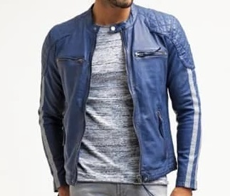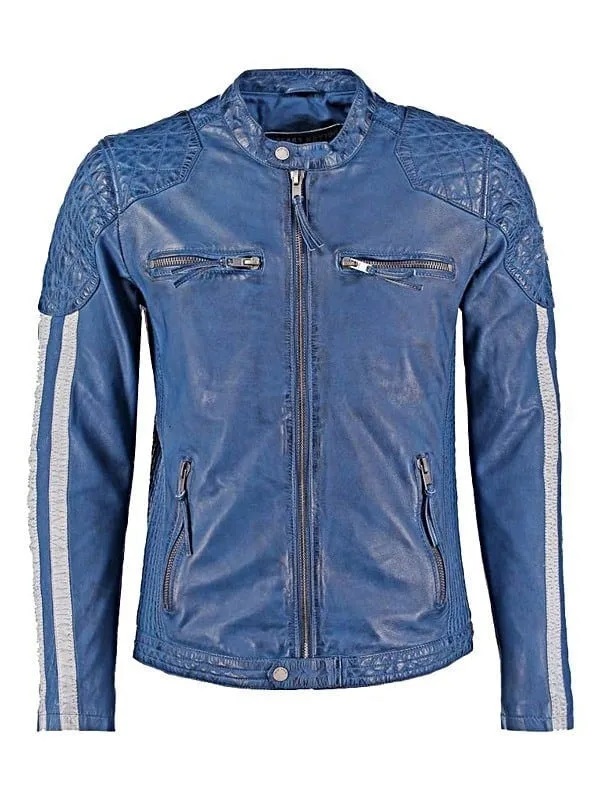 Men's Handmade Cafe Racer Leather Biker Blue Jacket with White Stripes