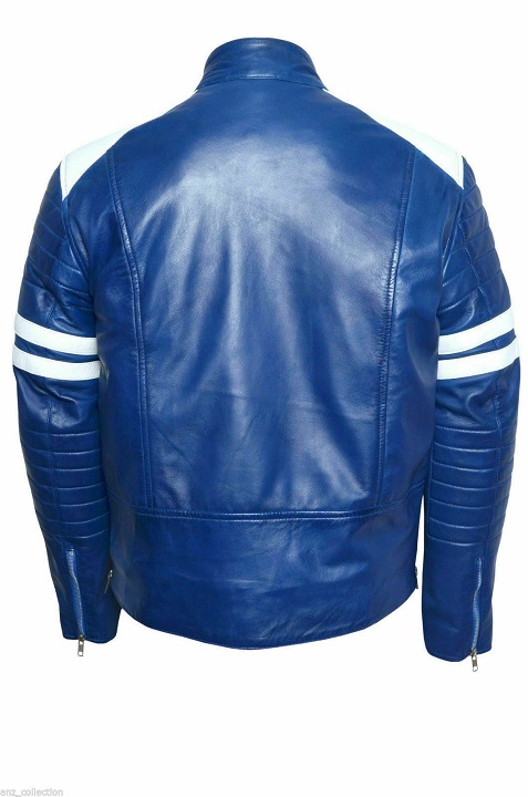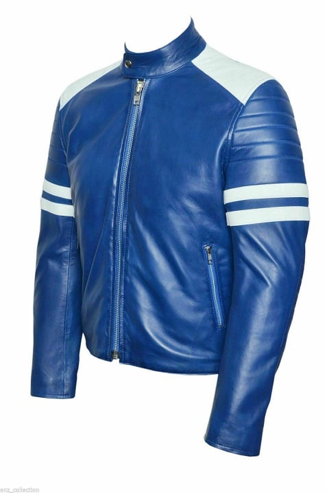 Men's Hand Stitched Fashion Leather Biker Jacket Blue Leather & White Strips Stylish Zipper Jacket