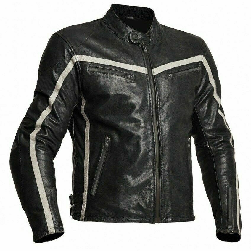Men's Handmade Black Leather White Strip Zipper Biker Leather Jacket