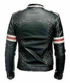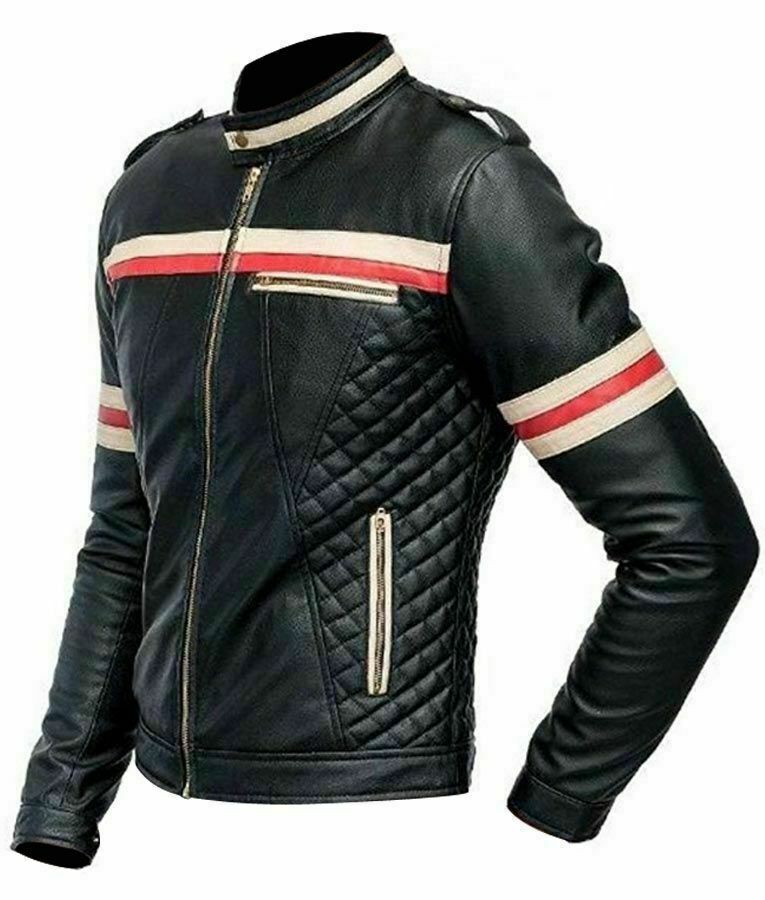 New Men's Handmade Black Leather With Multi Color Strips Fashion Zipper Style Biker Leather Jacket