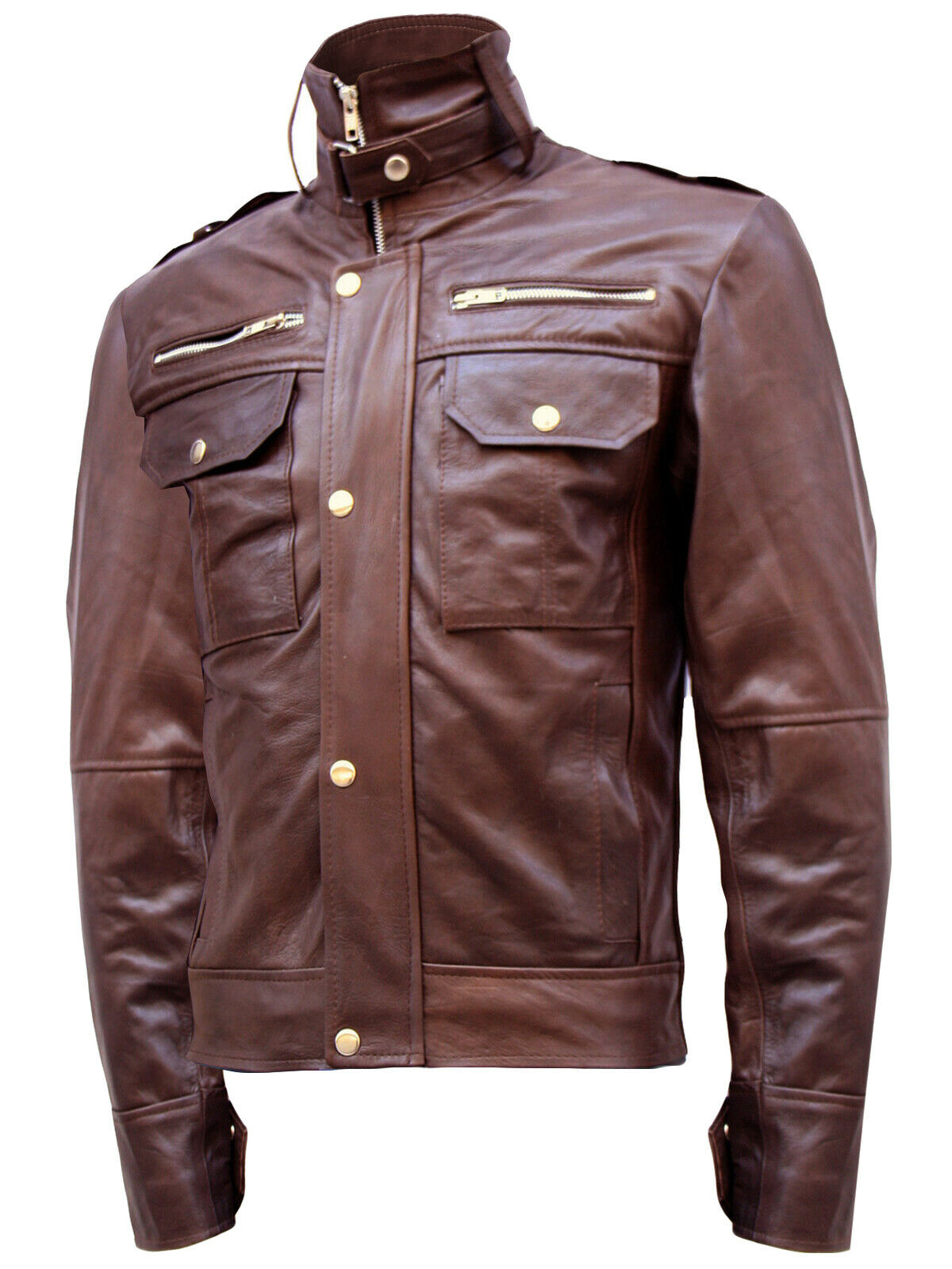 New Men's Handmade Brown Leather Bomber Zipper Style Front Pocket Real Cowhide Leather Biker Jackets