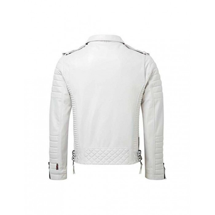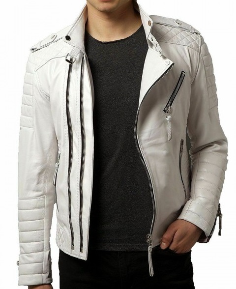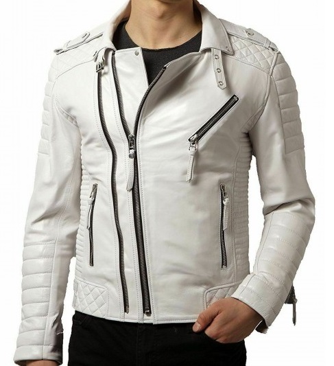 Men's New Custom Made White Leather Zipper Style Real Cowhide Leather Biker Jacket