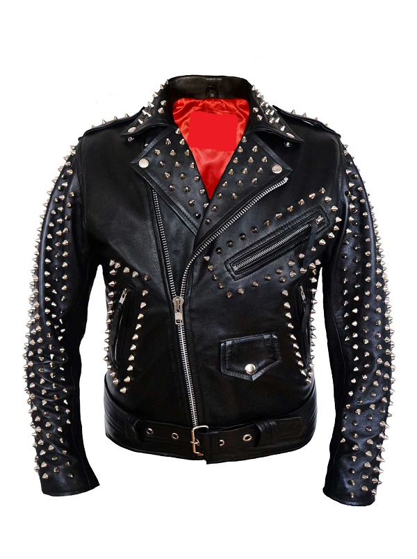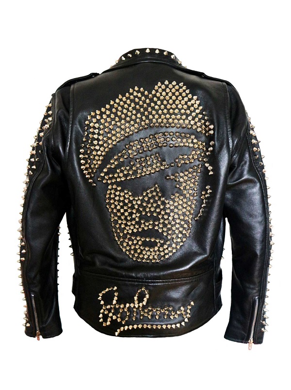 New Men's Custom Made Black Leather Full Metallic Studded Back Johnny Face Printed Zipper Belted Stylish Leather Jackets
