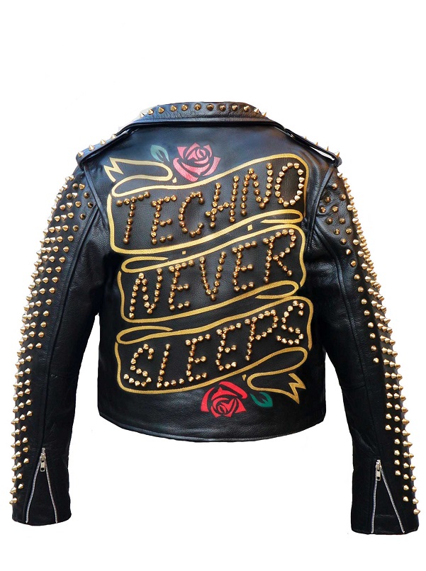 New Men Women's Custom Made Black Leather Full Metallic Studded Techno Never Sleeps Printed Zipper Belted Stylish Leather Jackets