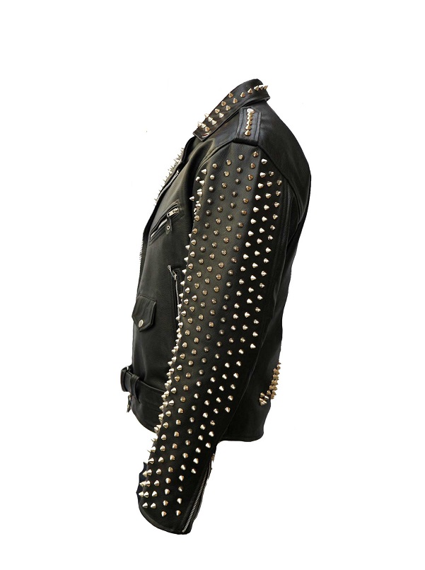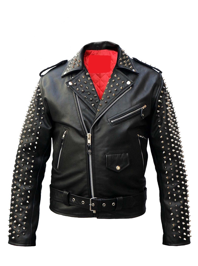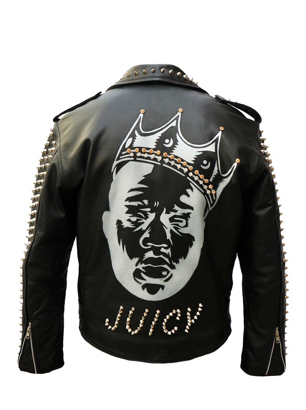 New Men's Custom Made Black Leather Full Metallic Studded Back The Juicy Face Printed Zipper Belted Stylish Leather Jackets