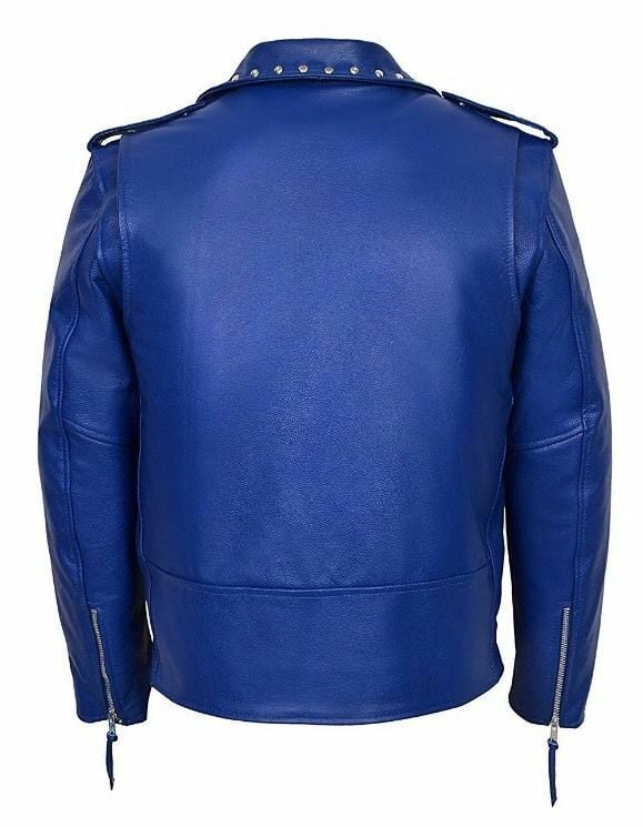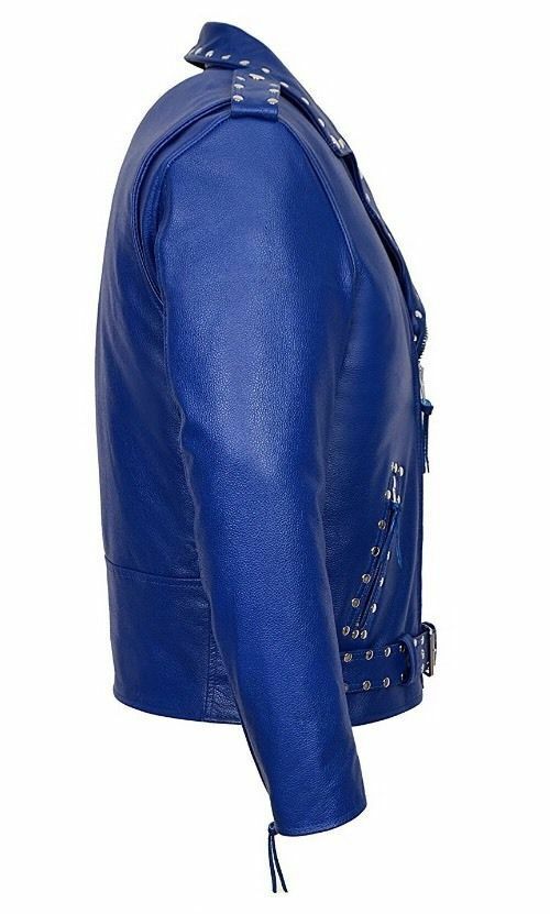 Men's New Brando Studded Slim Fit Blue Designer Real Cowhide Leather Fashion Jacket