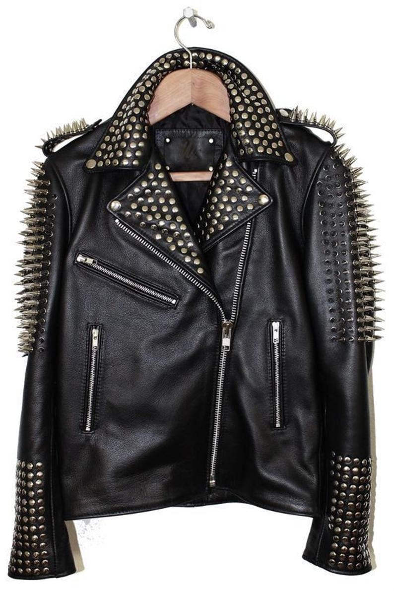 New Men's Handmade Black Punk Silver Long Spiked Studded Cowhide Leather Jacket Silver Studs Belted Front Zipper Biker Style fashion Jacket