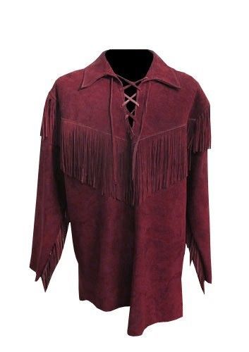 MEN'S NEW HANDMADE BURGUNDY MOUNTAIN MAN FRINGE BUCKSKIN SUEDE LEATHER SHIRT