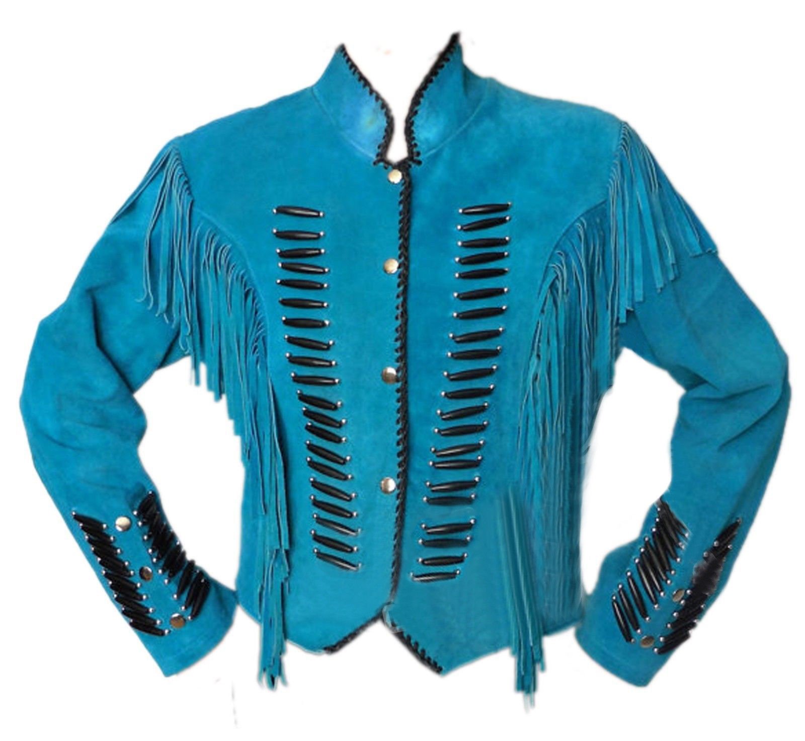 Men's New Handmade Blue Western Suede Bones / Fringes Cow Leather Jacket