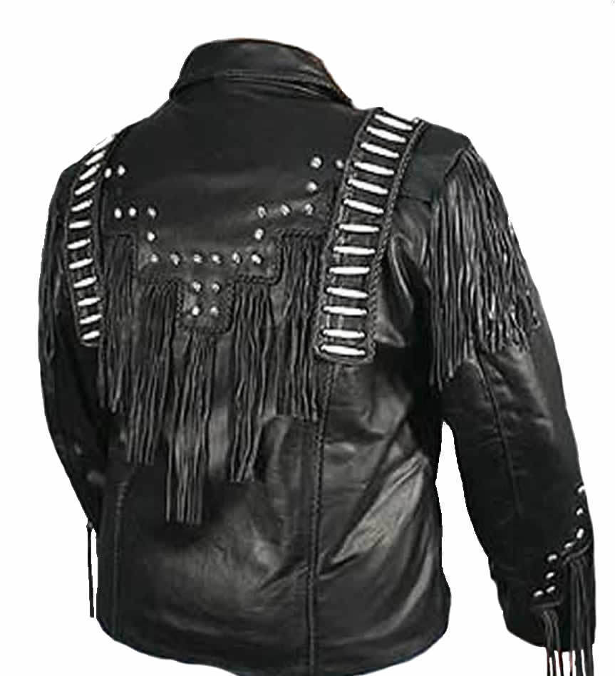Handmade Cowboy Men's New Black Western Cow Leather Jacket Fringed/Bones