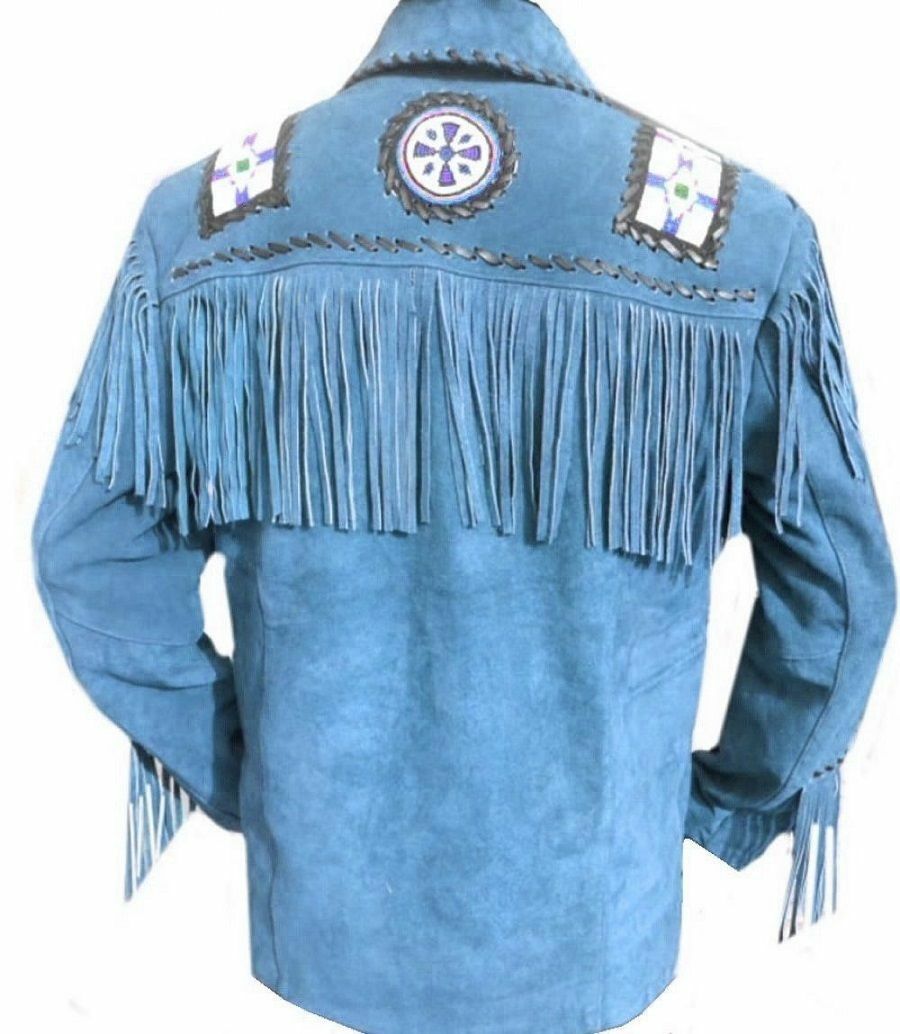 Men Blue Suede Leather Cowboy Jacket Fringes and Pearls Western Wear Coat