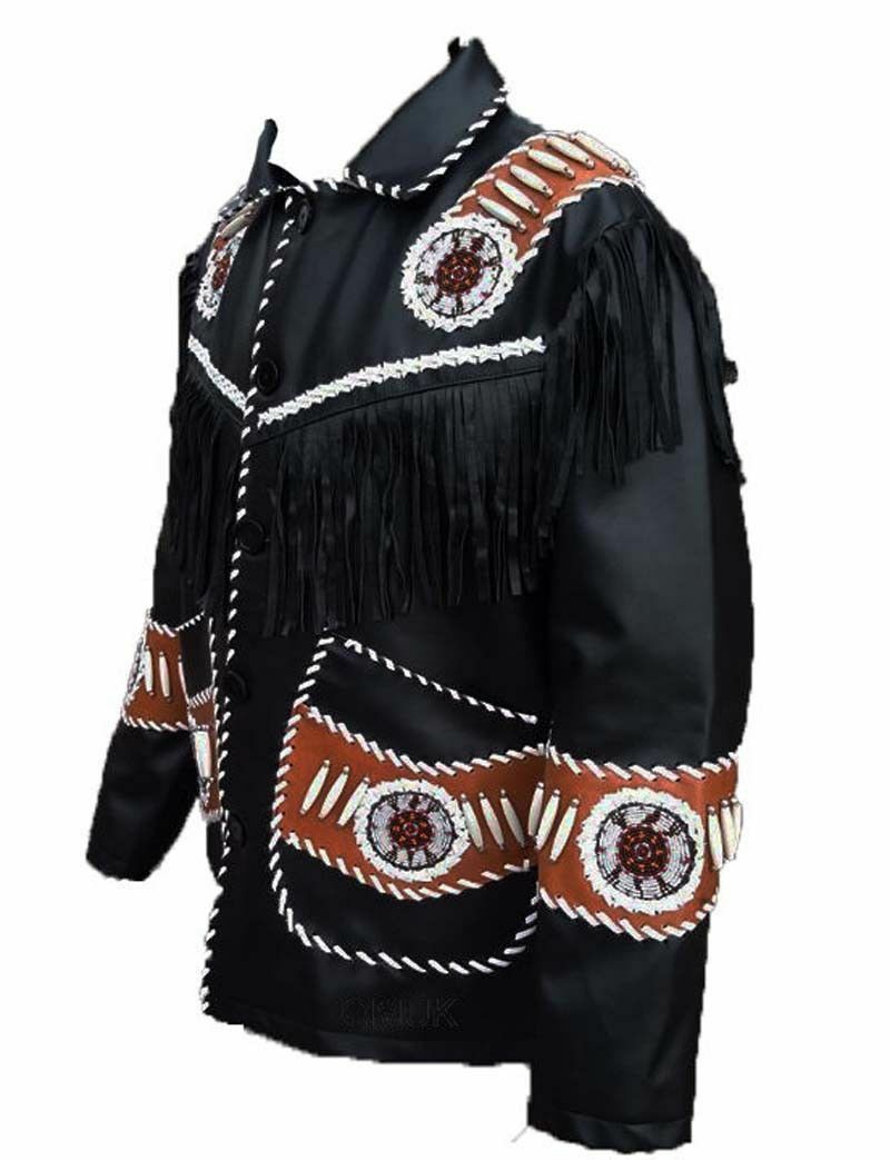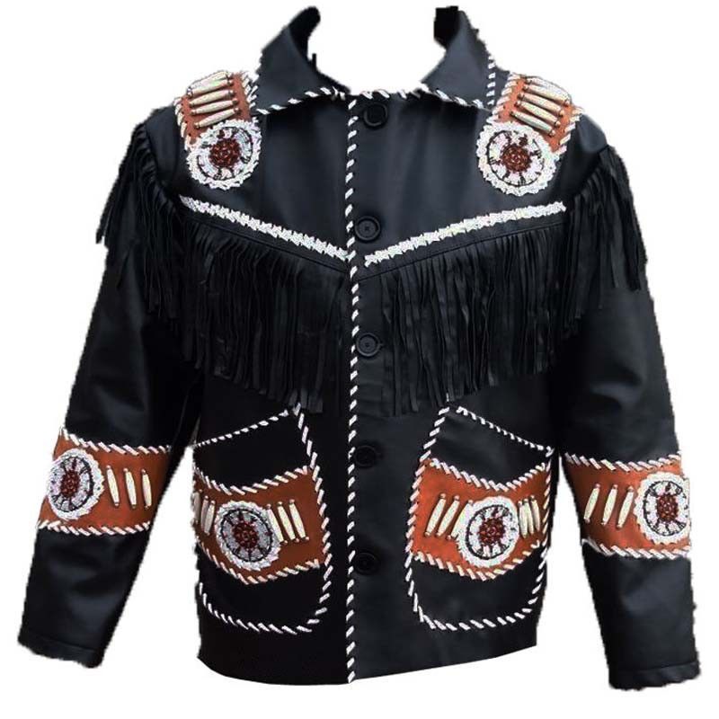 Men Cowhide Leather Jacket Cowboy Fringes and Pearls Western Wear