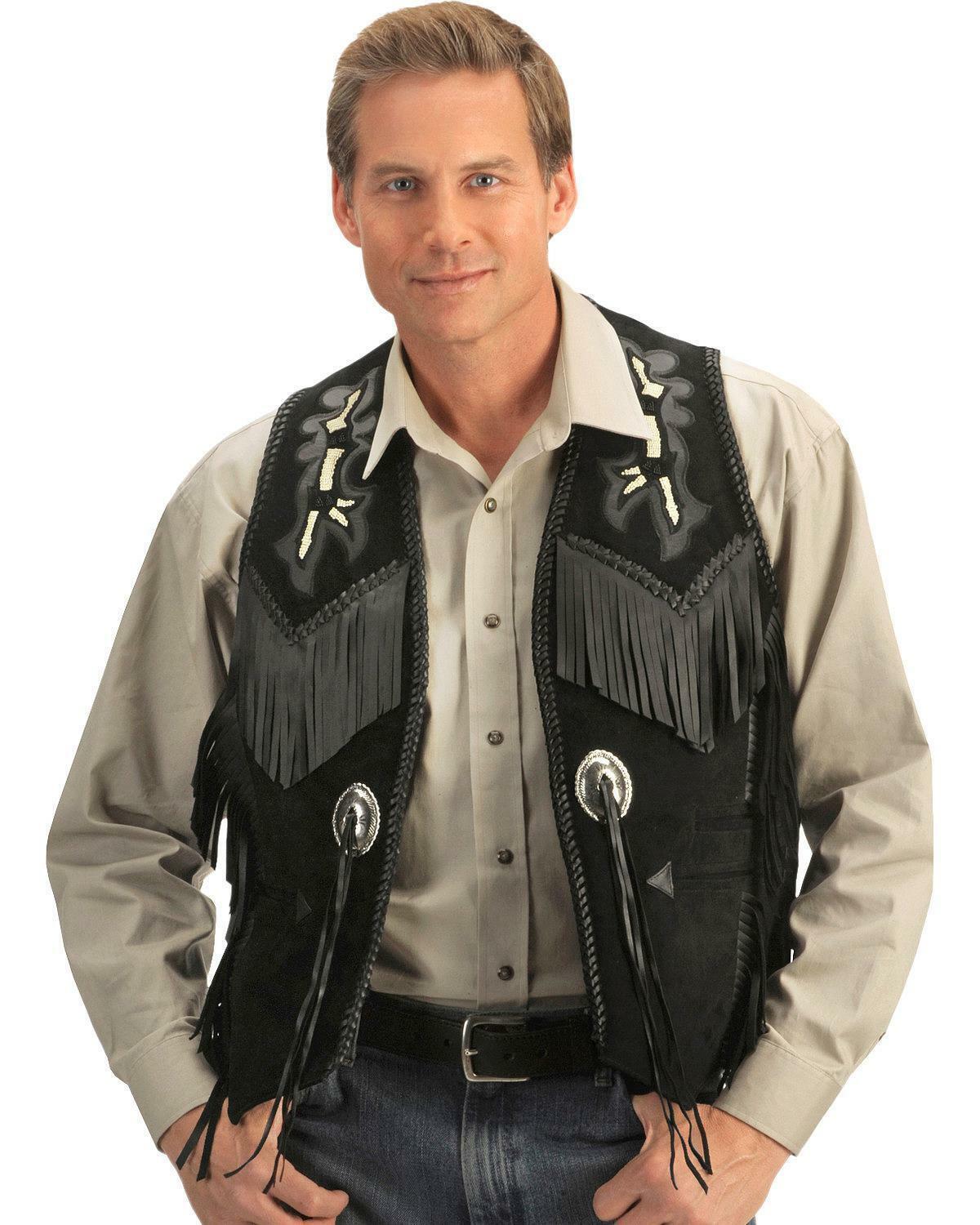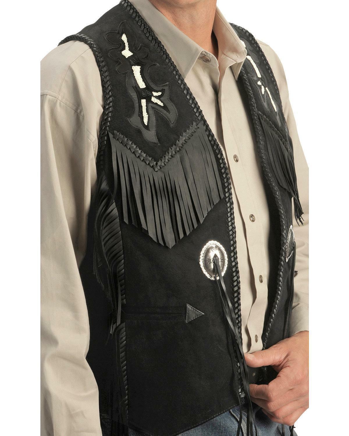 Men Black Suede Cowhide Waistcoat Fringes and Pearls Occidental Wear