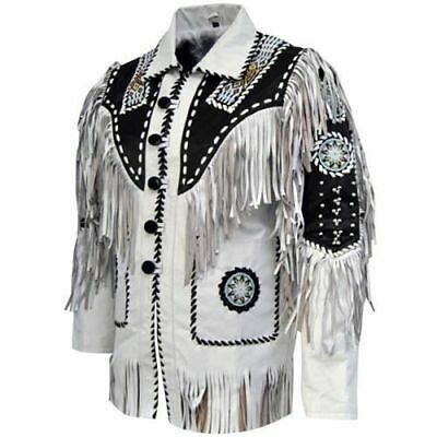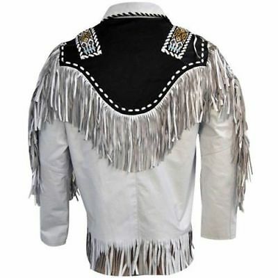 Men White Black Suede Leather Jacket Cowboy Fringed and Beaded Coat