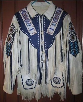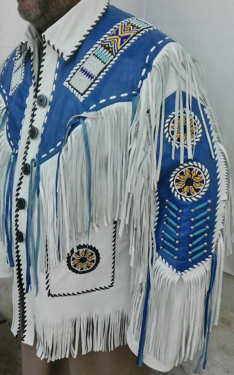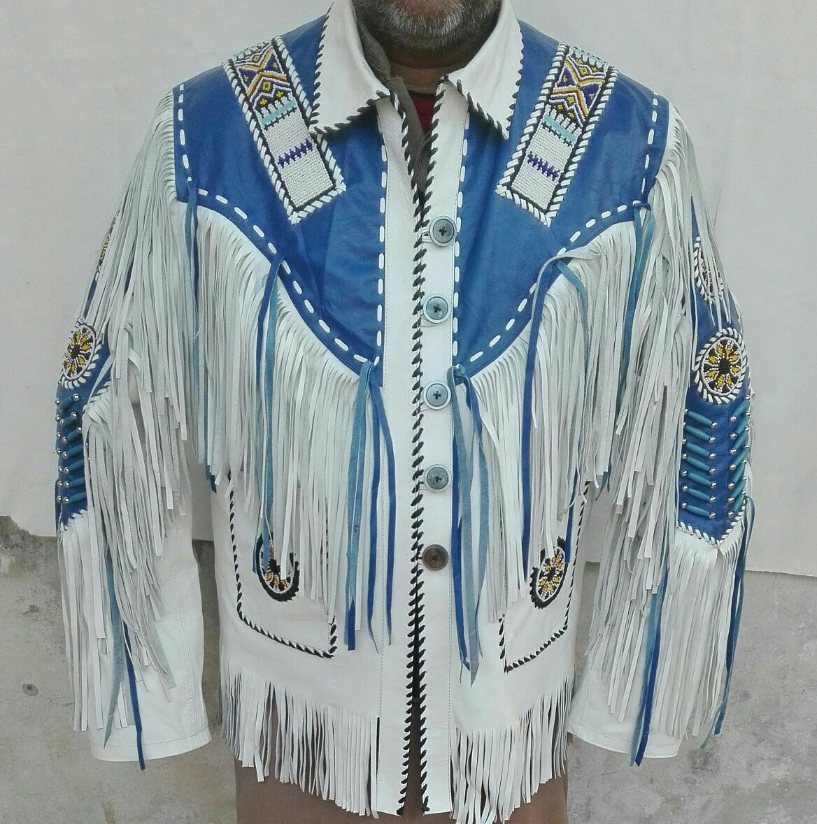 Men White Blue Suede Leather Vintage Jacket Fringed and Beaded Coat