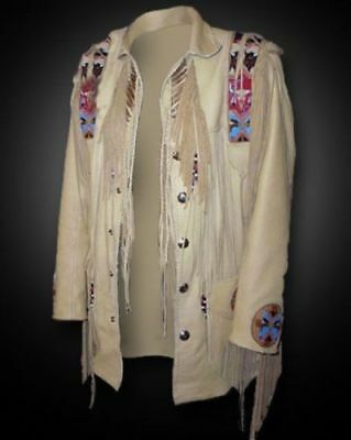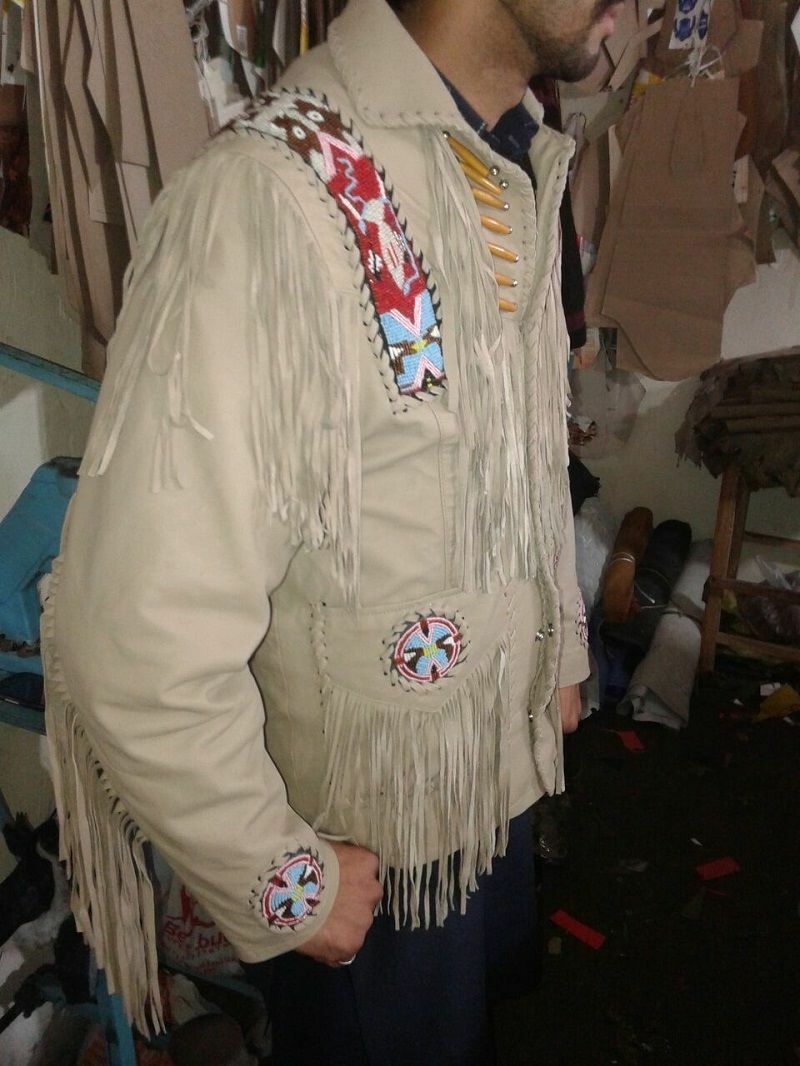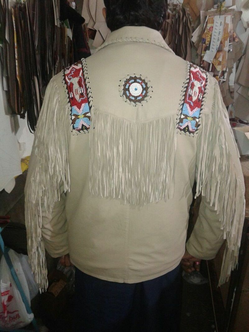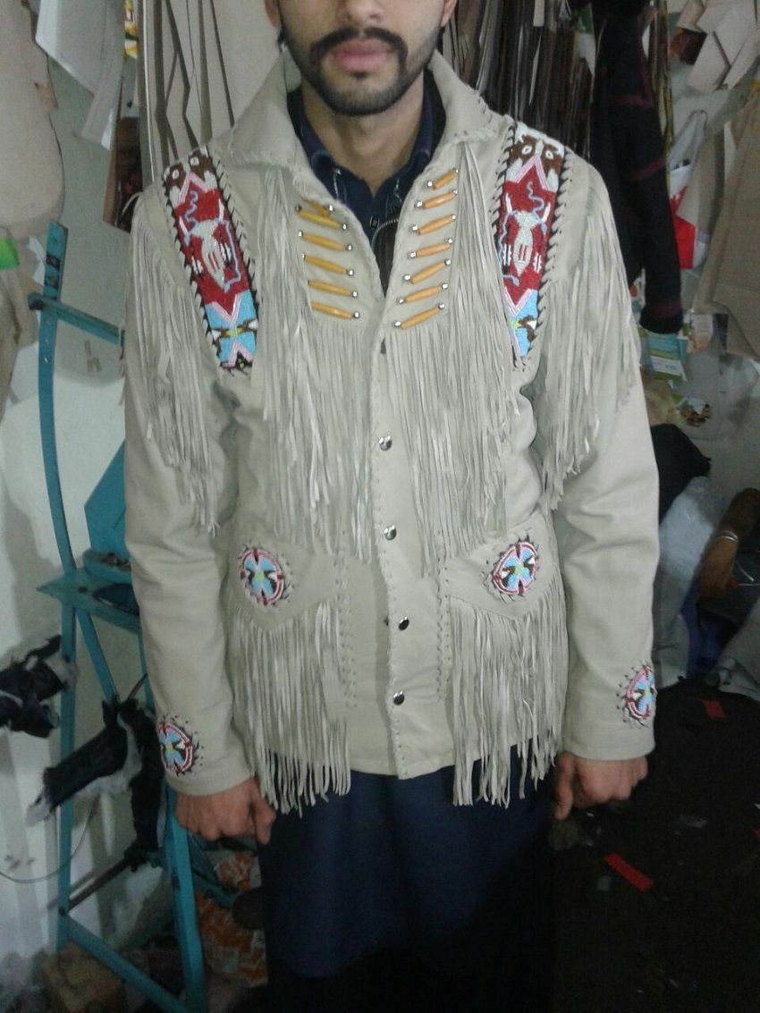 Men's Beige Suede Leather Fringed Jacket and Western Beading Wear