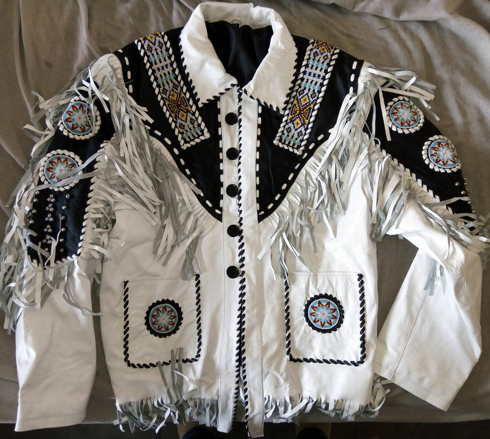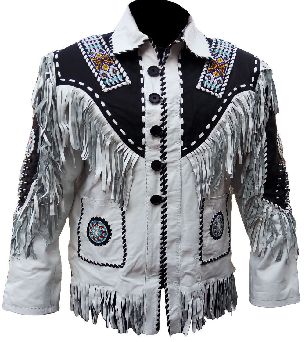 Men White Black Suede Leather Jacket Cowboy Fringed and Beaded Coat