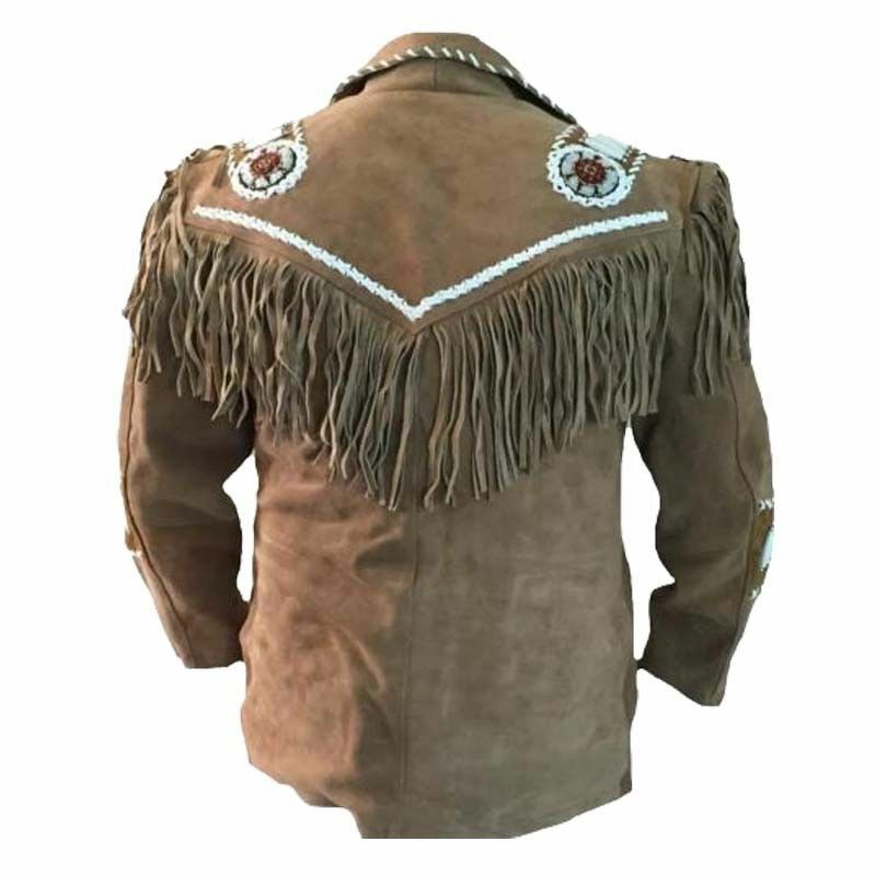 Men Brown Suede Leather Jacket Cow-boy Fringed and Beaded Coat