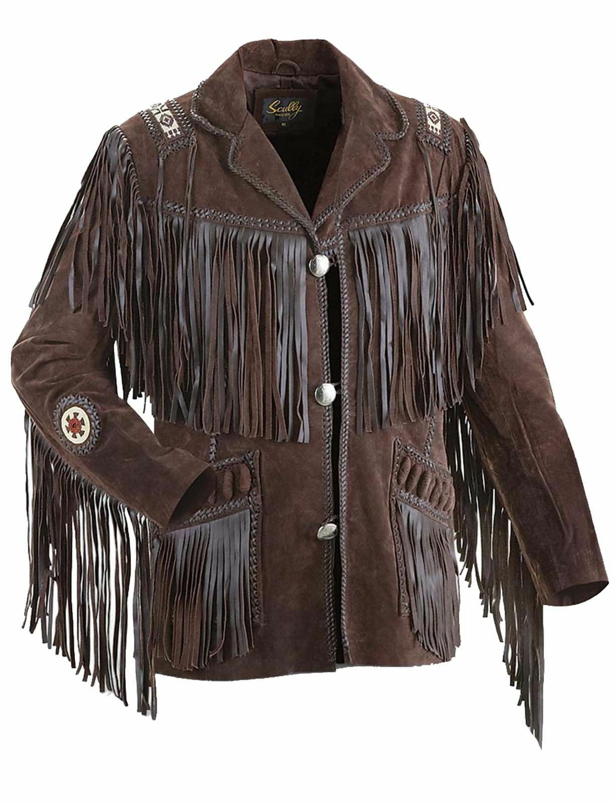 Men's Brown Suede Cowhide Leather Fringed Jacket and Beaded Coat