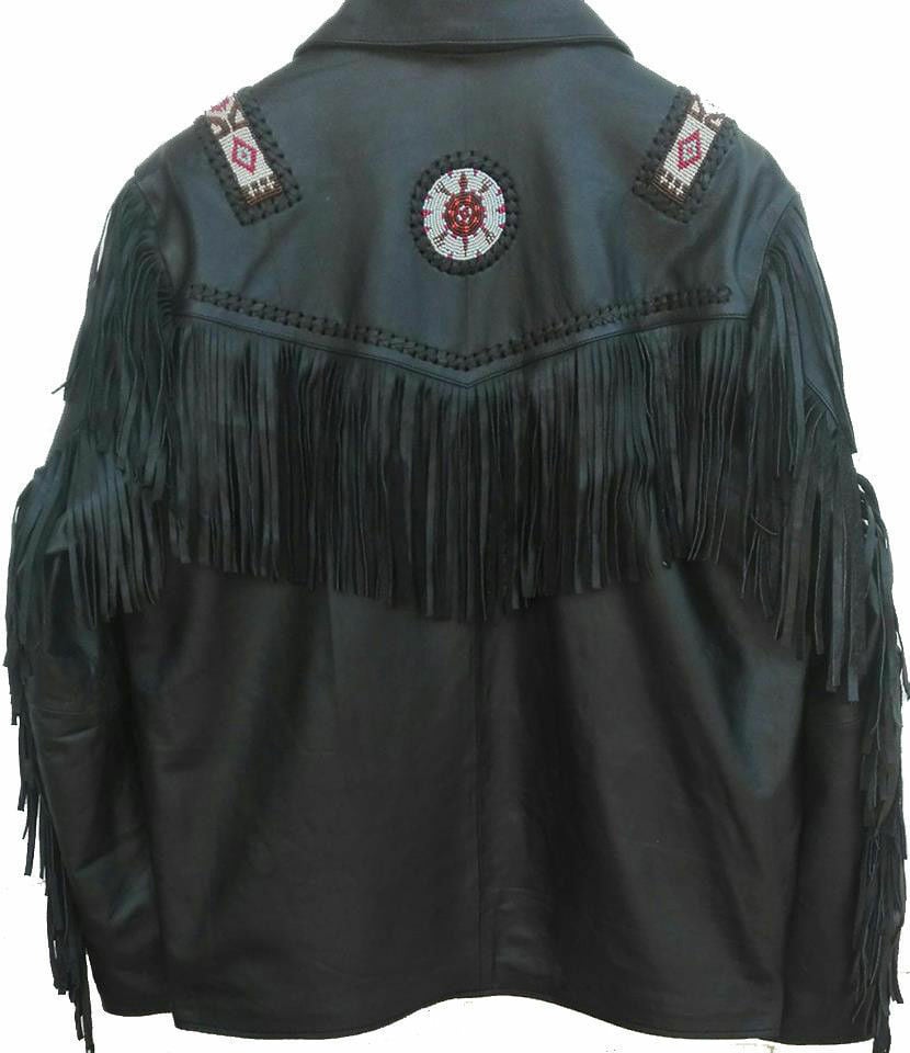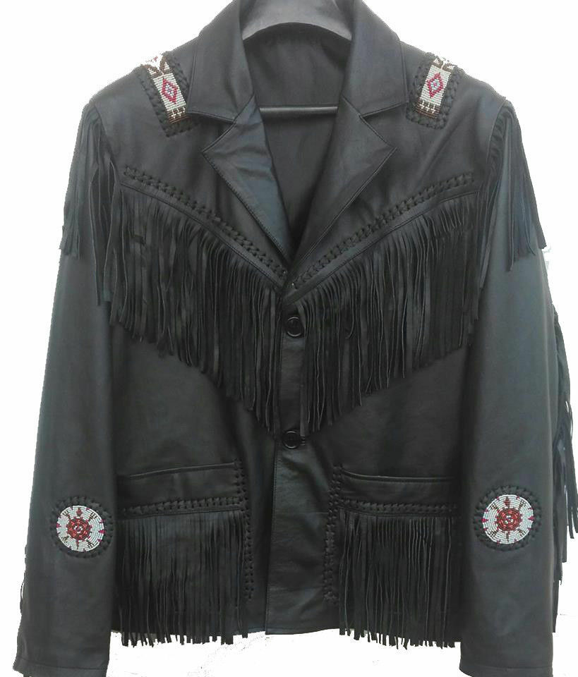 Men Black Cowhide Leather Cow-boy Jacket Fringed and Beaded Western Coat