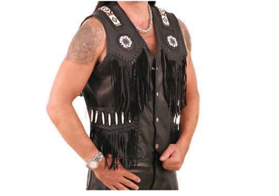 Men Black Cowhide Cowboy Leather Waistcoat Fringes and Western Beads Dress