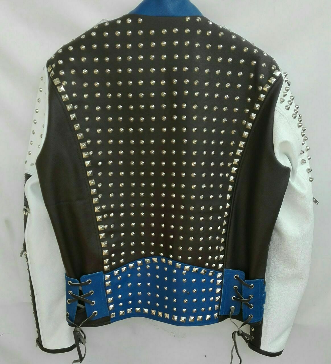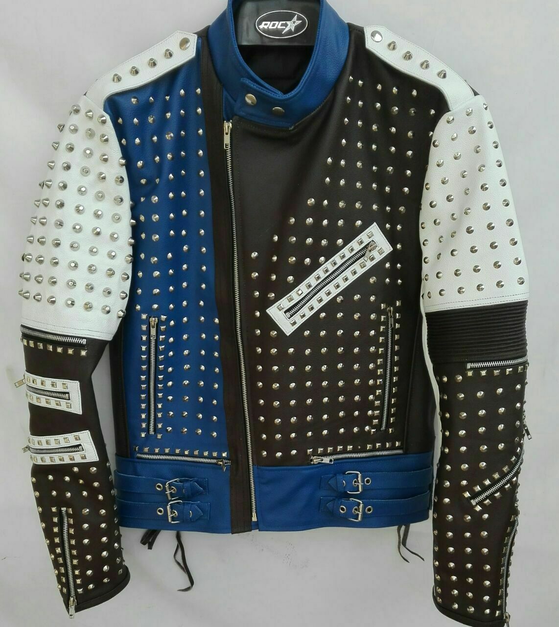 Mens Handmade Fashion Jacket Real Leather Silver Stud Style Motorcycle Zipped Up